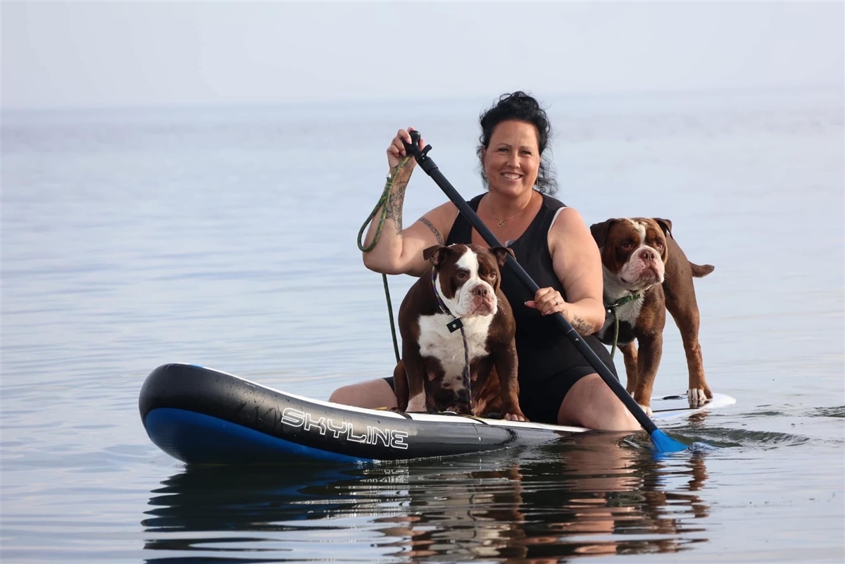 Vi arbejder også målrettet med træning, særligt HLT – hverdagslydighedstræning – hvor vi går efter de forskellige arbejdstitler. Derudover er hundesvømmehallen fast inventar i vores uge, ofte flere gange om ugen, og når nu vi er ved vandsporten, så nydes der også mange timer på vandet på vores paddleboard og hundene elsker det.