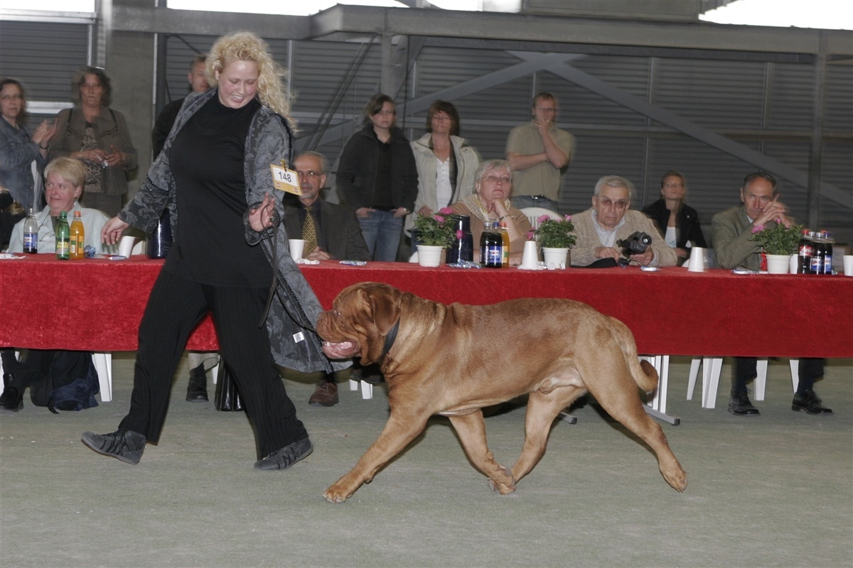 Udstilling har haft en stor betydning for mig fra starten, og i 2004 kom Meeko ind i mit liv – en hund, der for alvor viste mig vejen frem i udstillingsringen. Meeko var den første Dogue de Bordeaux i Danmark, der vandt Gruppe 2 i Ballerup i 2005, et øjeblik jeg aldrig glemmer. Samme år skrev han også norsk historie, da han blev placeret som nummer 3 i Gruppe 2 i Kristiansand. Det var resultater, der åbnede mine øjne for, hvad udstilling også kan være i udlandet, og som gav mig en dybere forståelse for racens kvaliteter, når sundhed, type og mentalitet går op i en højere enhed.